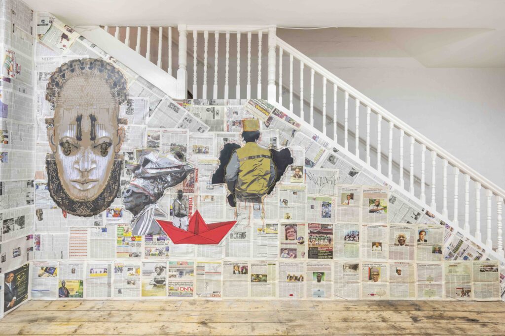 Description: Echo is an installation that draws from Joseph’s ongoing collection of Nigerian newspapers, sourced since 2020 but with articles dating back to 2018. By revisiting these archives, Joseph “un-archives” cultural memories, preserving elements of displaced or forgotten heritage. Echo explores themes of migration, cultural transformation, and the fusion of old and new identities in new environments.