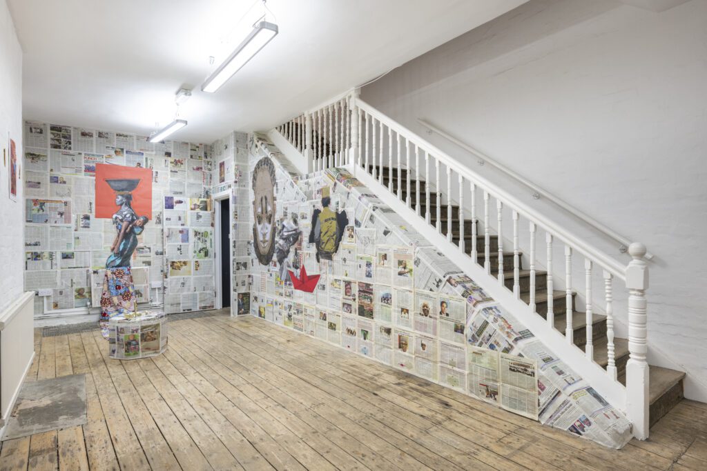 Medium: Installation of archived and collected Nigerian newspapers (2018) with digitally printed artwork on wall, Ankara fabric floor covering, hanging natural coral beads, and small Afro combs.